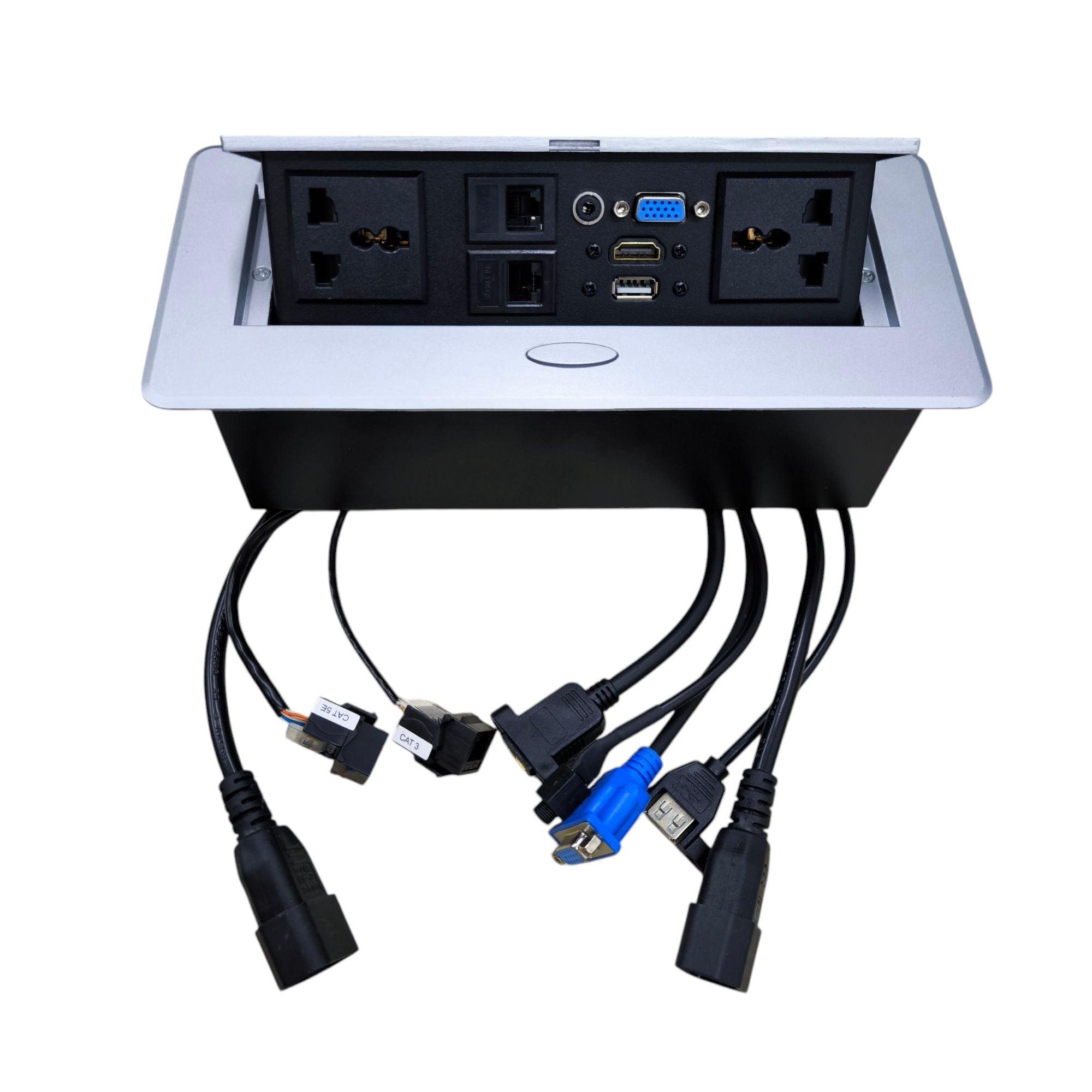 Grippes Pop-up 2 Gang Outlet 10A 220V AC with LAN TEL VGA HDMI USB 3.5mm Chrome